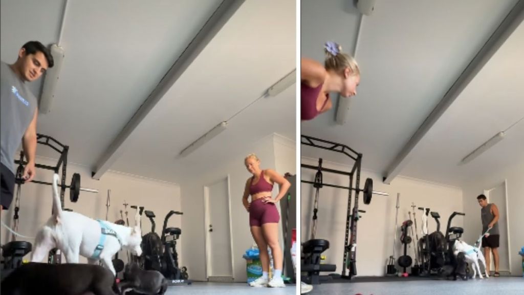 The video begins inside what appears to be a home gym, where the puppies wait curiously with Billie’s owner. Billie then enters alongside her dad, calmly approaching the newcomers. Rather than showing hesitation, the puppies rush toward her, eager to sniff and investigate. Billie responds with remarkable patience, standing still and allowing the smaller dogs to circle her while she gently acknowledges them.